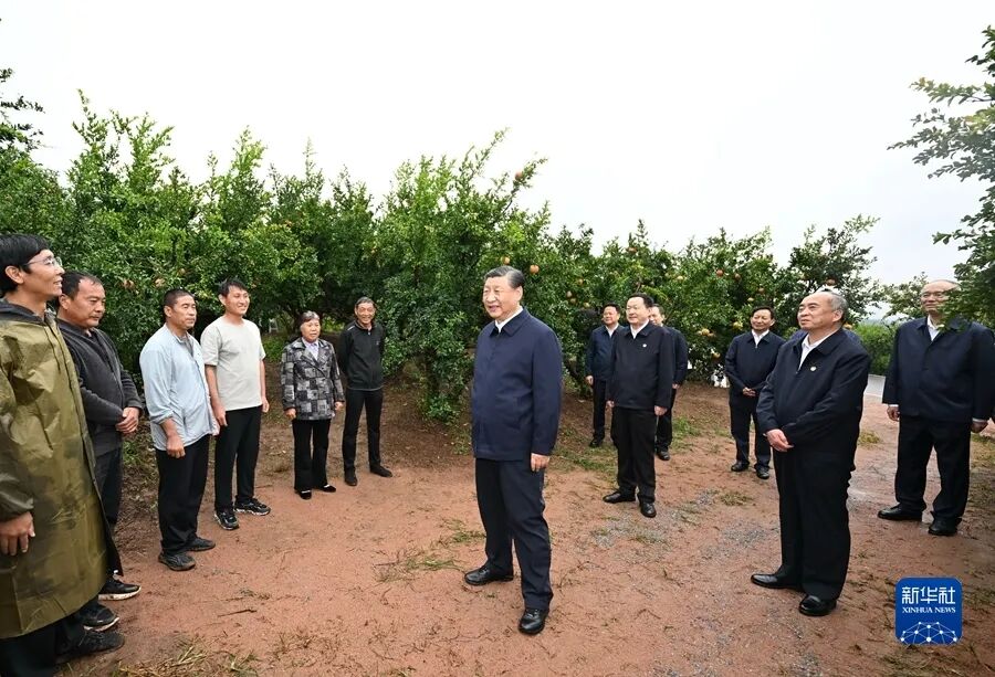 9月24日,中共中央总书记、国家主席、中央军委主席习近平在浙江考察结束返京途中,来到山东省枣庄市考察。这是习近平在位于峄城区的冠世榴园石榴种植园同老乡们亲切交流。新华社记者 谢环驰 摄