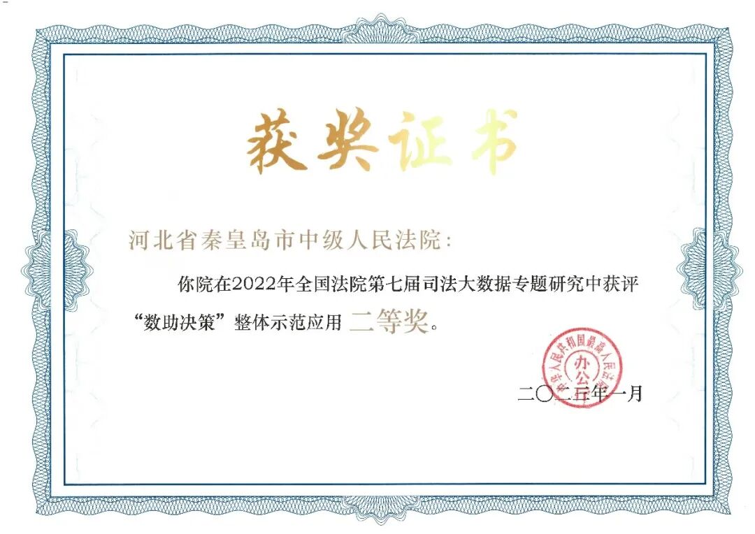 近日,最高人民法院办公厅下发了《关于2022年全国法院司法大数据专题研究完成情况的通报》。由秦皇岛中院与中国司法大数据研究院、北京航空航天大学联合申报的课题《十八大以来网络犯罪治理成效评估研究(2013.1.1-2021.12.31)》,从全国977家法院中脱颖而出,获得第七届司法大数据专题研究专题整体示范应用类二等奖。这也是秦皇岛中院司法大数据专题研究课题第5次获得全国级奖项。